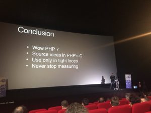 L’équipe Kiboko en route pour le PHP tour 2018[/caption] Après une razzia sur les stands des sponsors, c’est le sac pleins de goodies que nous assistons à la première conférence de la journée. Nikolas Grekas nous explique comment Symfony 4 a pu tirer le maximum du potentiel du moteur de PHP7.